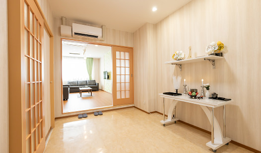 浴室、キッチン、仮眠室を備え、落ち着いた雰囲気でゆっくりお休みいただけます。通夜の際も安心してご利用いただけます。