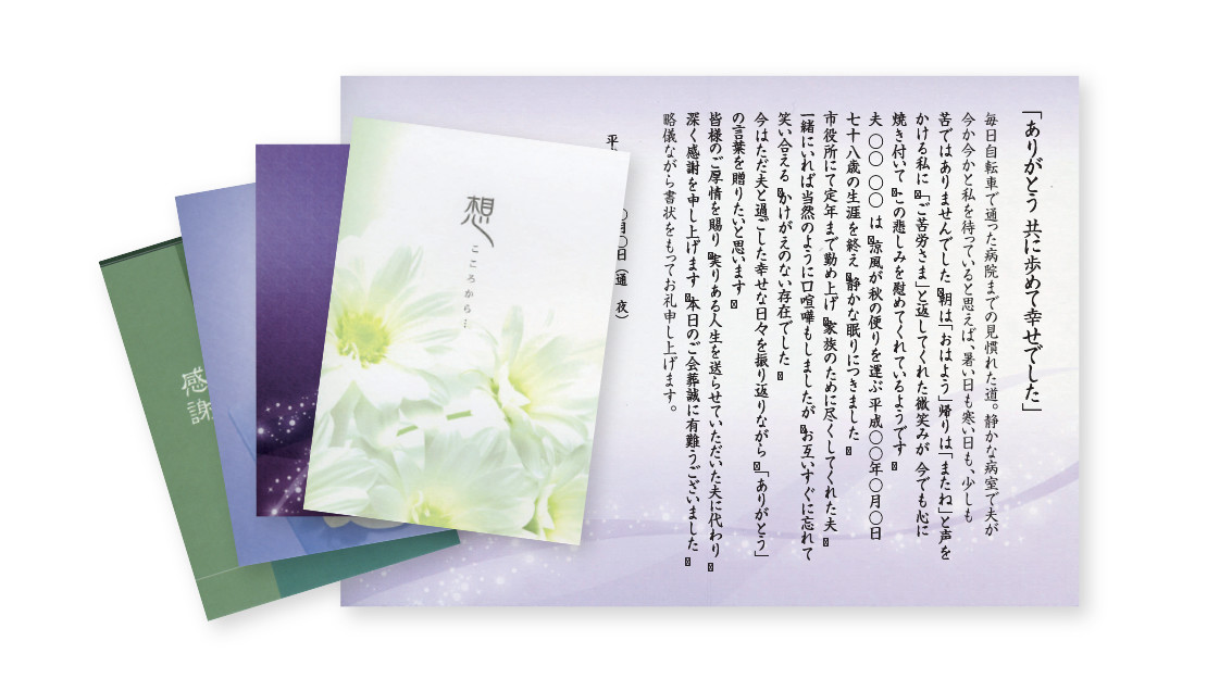 故人様の人柄や、ご遺族の感謝の気持ちを一枚の会葬礼状に綴りました。